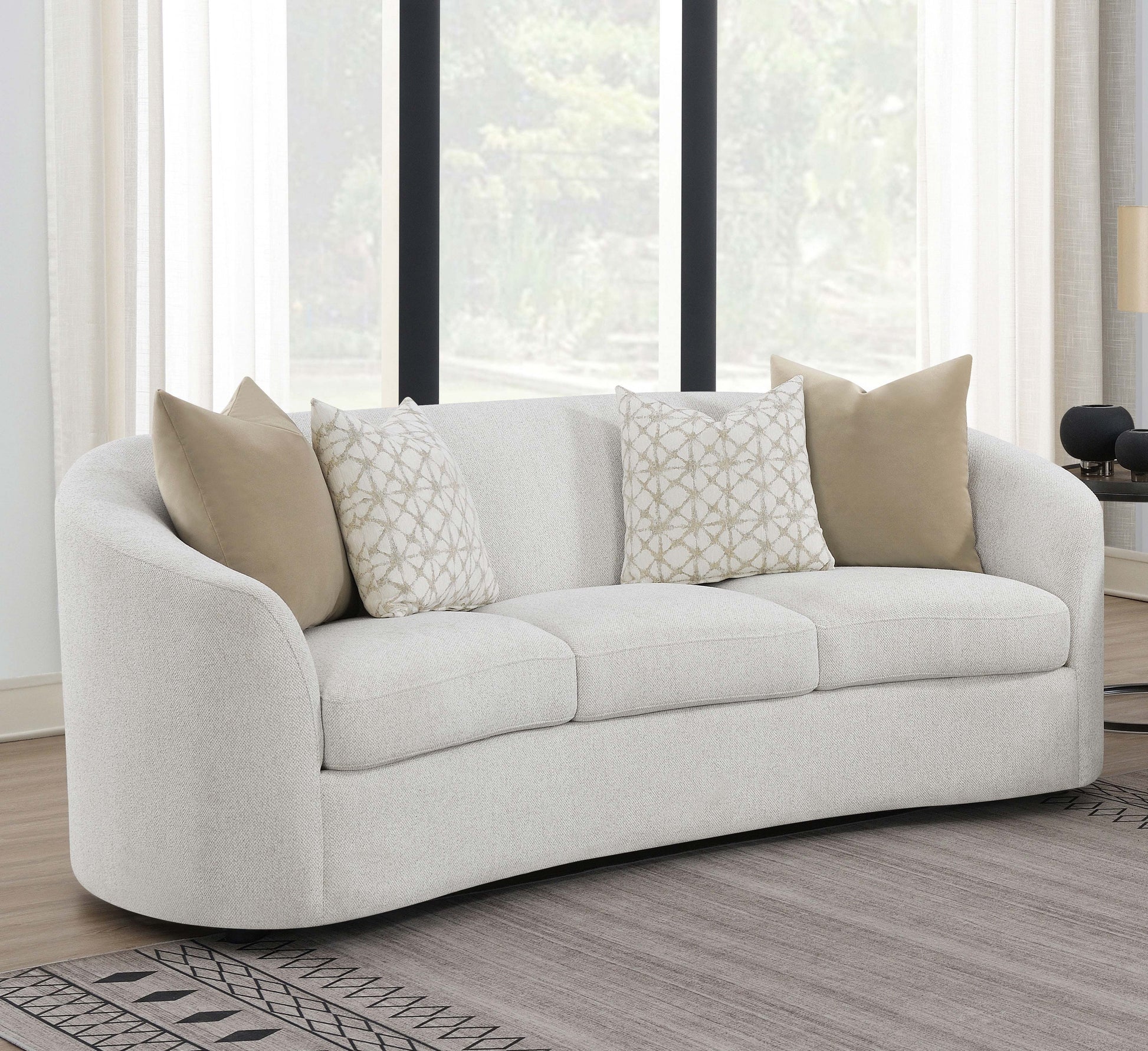 Bring inviting sophistication to your space with this contemporary curved sofa, featuring a soft latte boucle fabric that highlights its smooth contours. The sloped armrests and tight back lend an elegant silhouette, while plush seat cushions ensure lasting comfort. Coordinating accent pillows filled with premium faux down add an extra touch of luxury. With its clean lines and textural appeal, this sofa becomes a refined centerpiece that blends warmth, modern style, and timeless comfort.