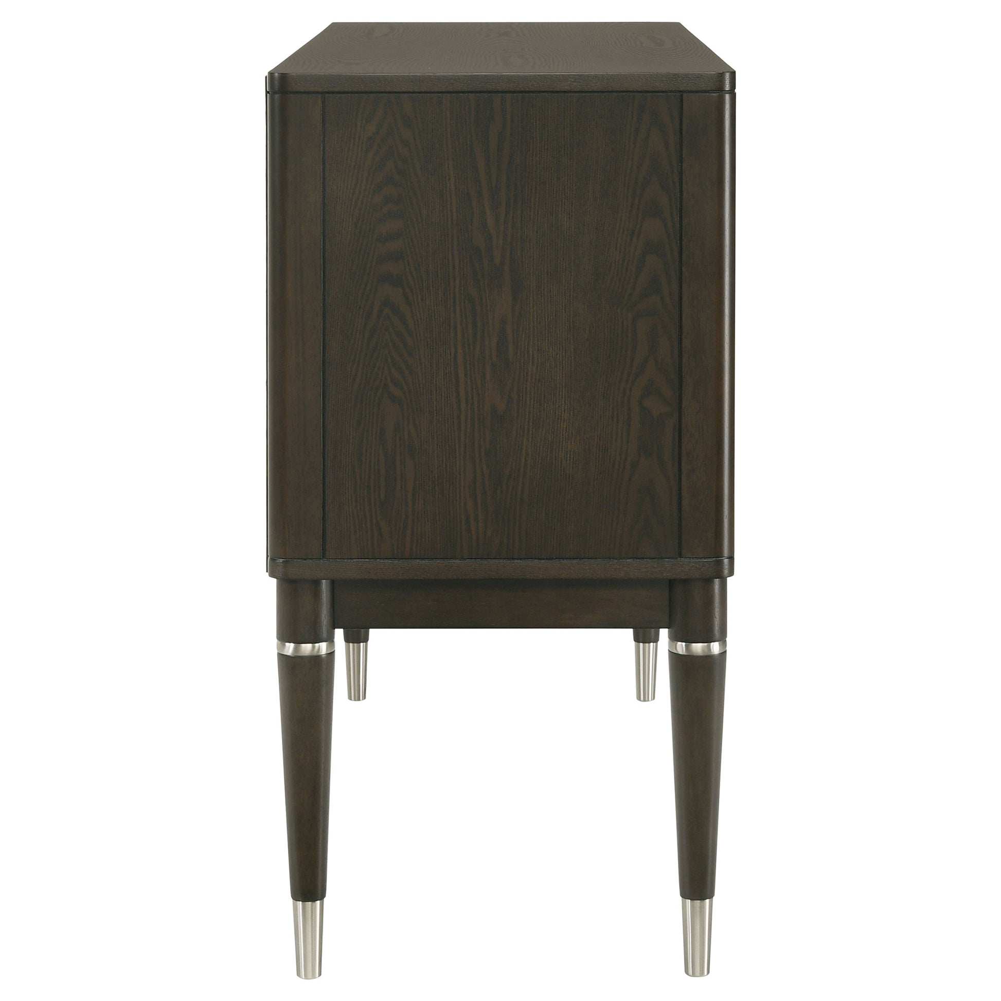 Add both style and functionality to your dining room with this elegant sideboard, finished in a sophisticated ash brown wood tone. The clean-lined design features four cabinet doors that open to reveal spacious shelving, perfect for storing tableware, linens, or other essentials. Crafted from engineered wood, rubberwood, and ash veneer, it ensures long-lasting durability. Sleek metal-capped tapered legs and minimalist hardware accents complete the modern aesthetic, making this sideboard a refined and practical choice for your dining area.