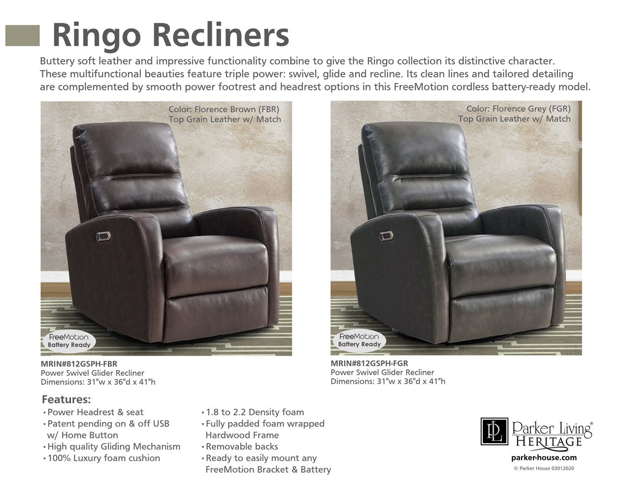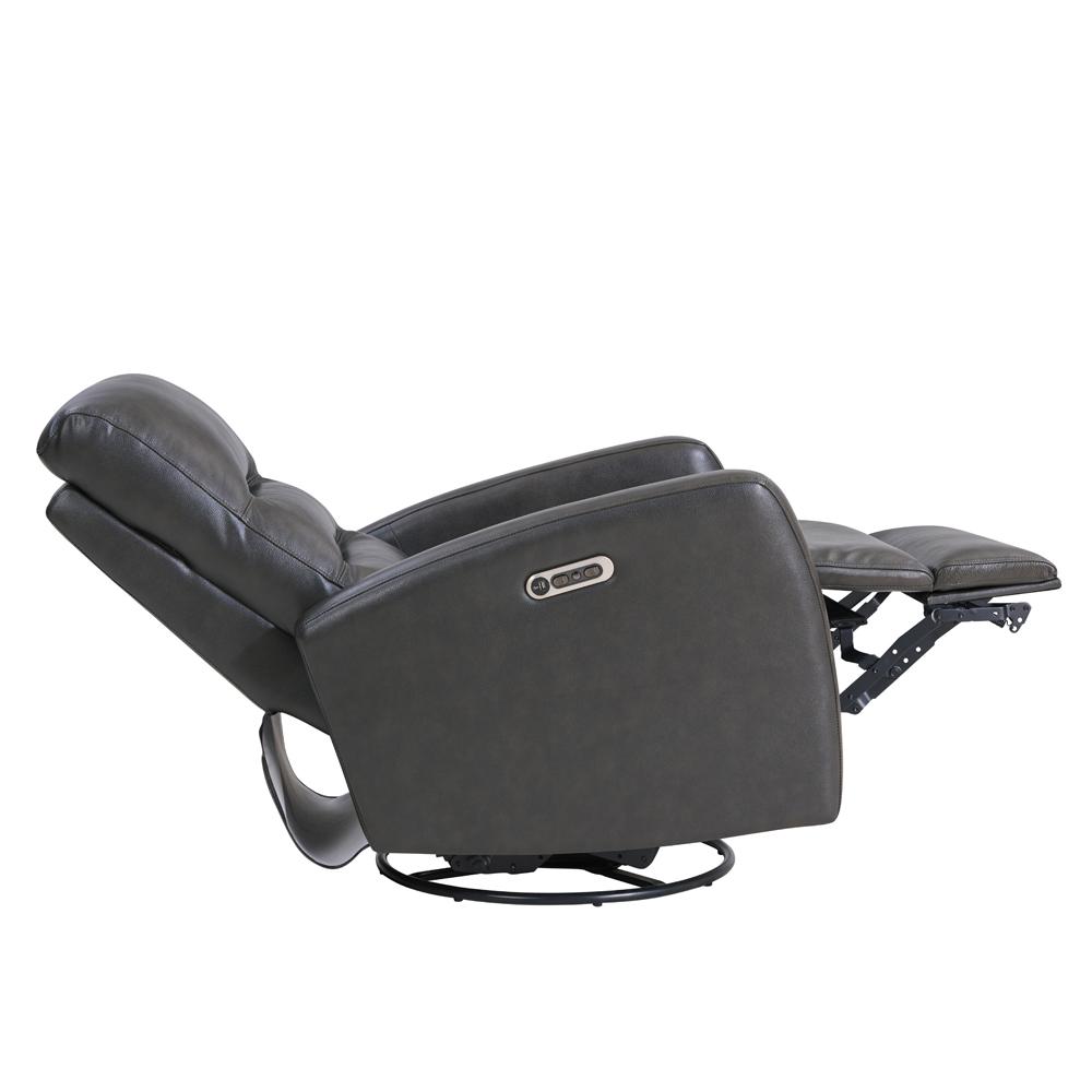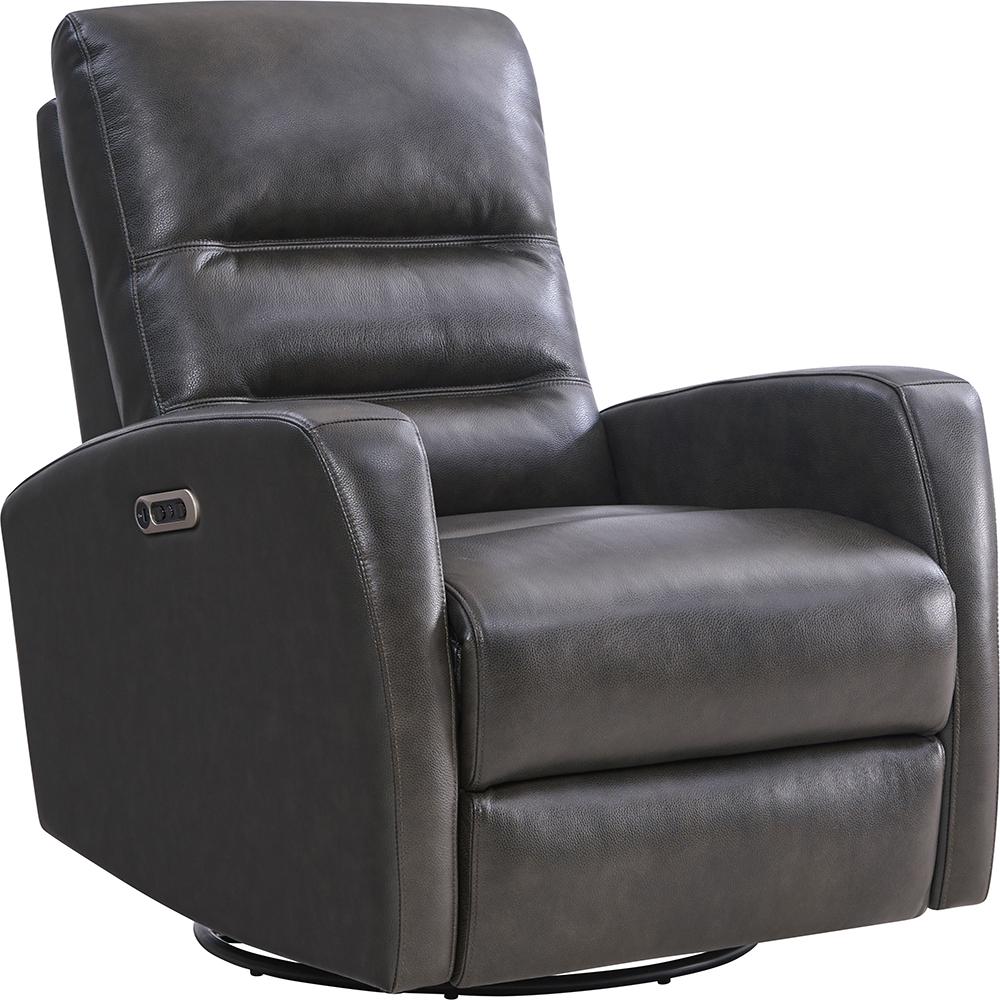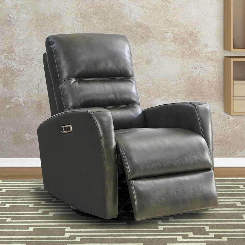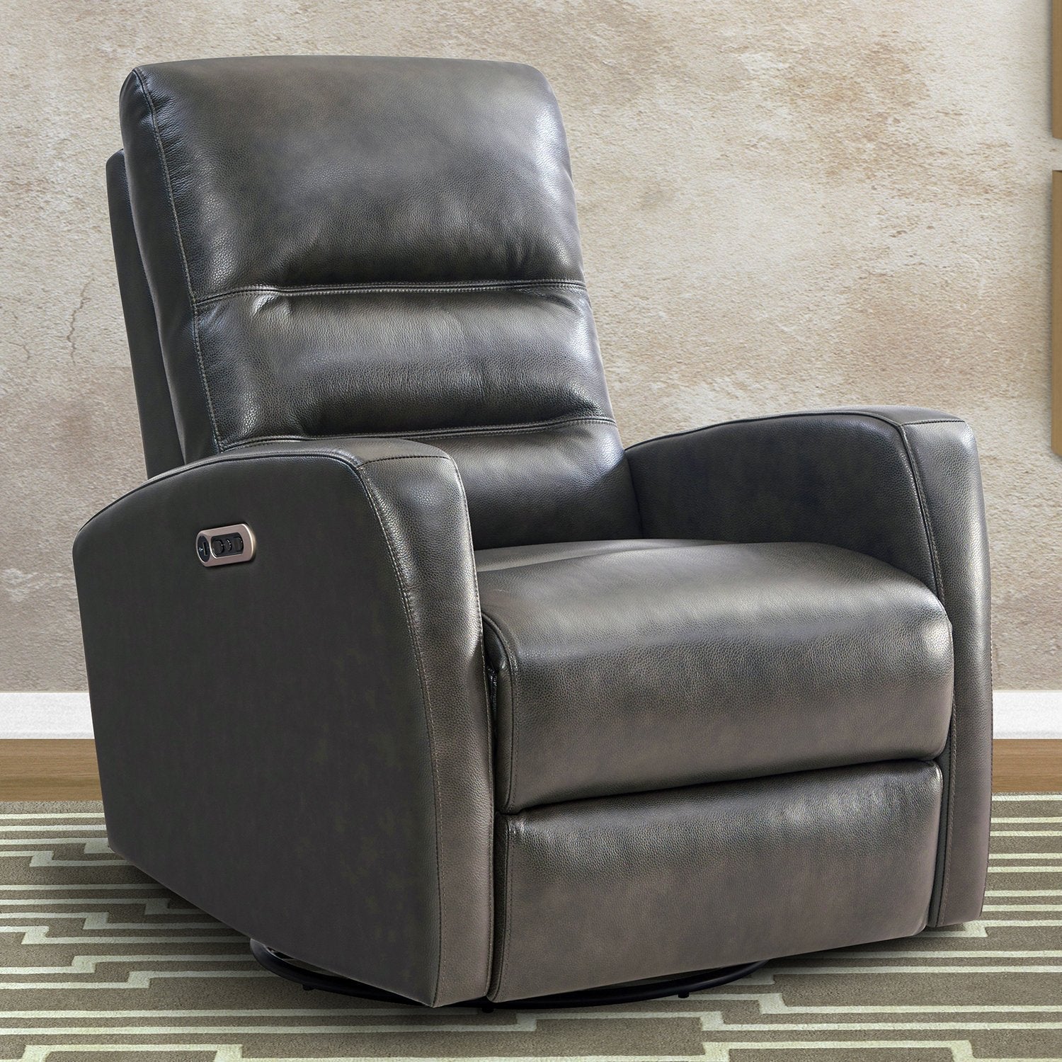 It's hard to stay awake when you're in the comfy embrace of the Ringo power swivel, glider recliner. A buttery soft, top grain leather in Florence Grey highlights its sophisticated silhouette and tailored appeal.