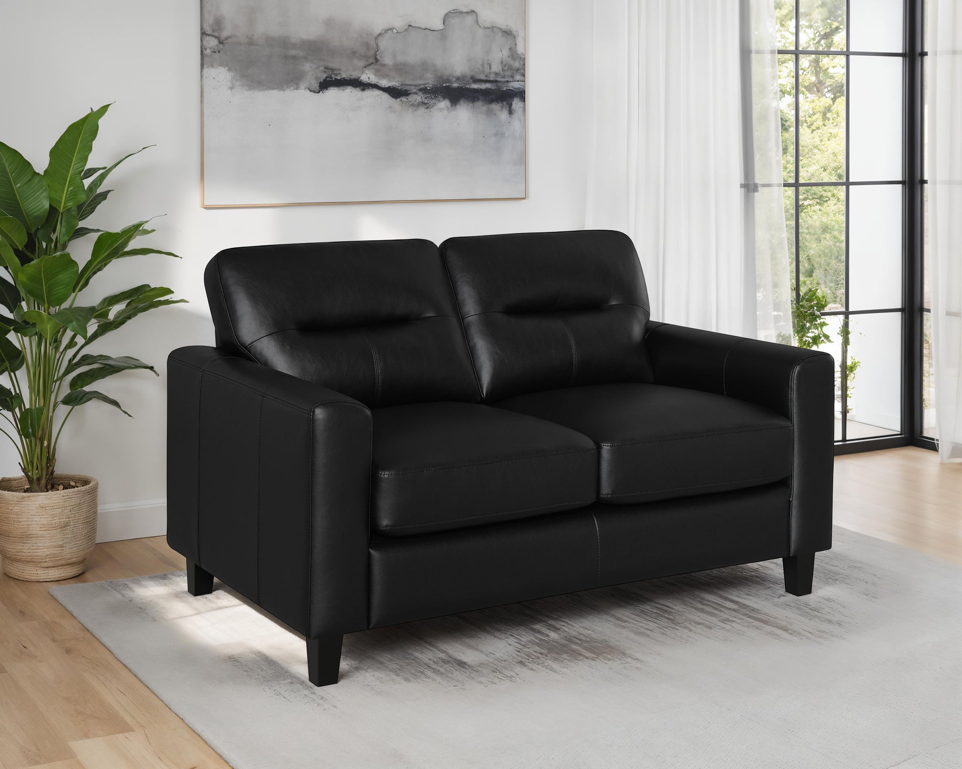 Balanced in scale and quiet in confidence, this loveseat offers a space for connection and calm. Its clean silhouette is framed by broad arms and softened by plush seating wrapped in smooth upholstery. Gentle stitching adds a hint of refinement across each surface. Crafted to complement the room or stand alone in smaller settings, it invites shared comfort and effortless repose.