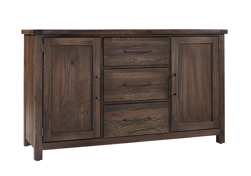 62 inch server crafted from solid American Oak. 3 drawers with server tray and 2 doors with fixed shelf