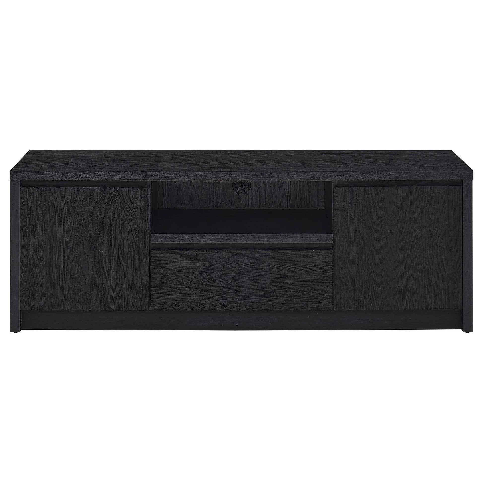 • Compact TV stand includes two cabinets, an open shelf with cable management, and a central drawer